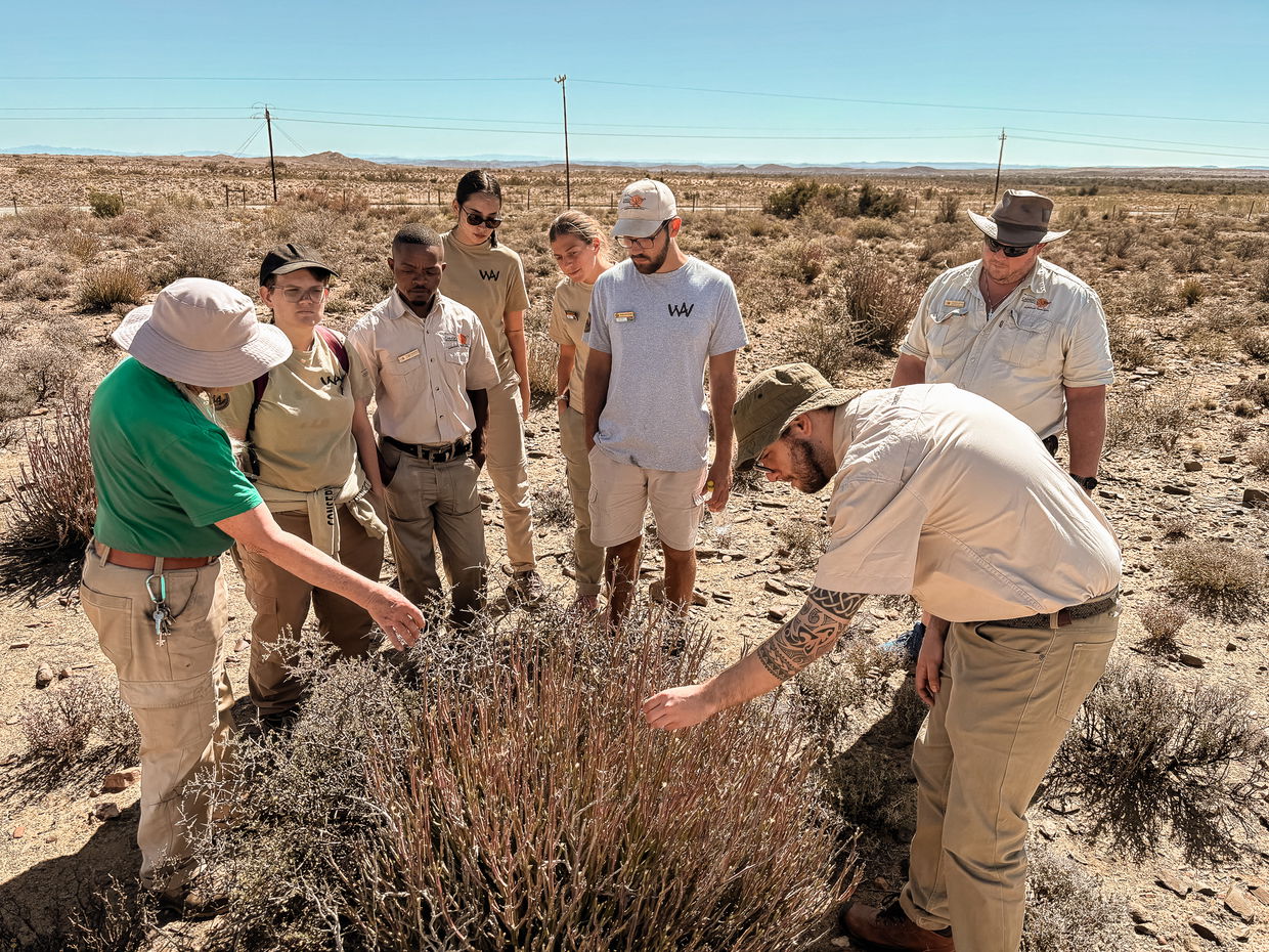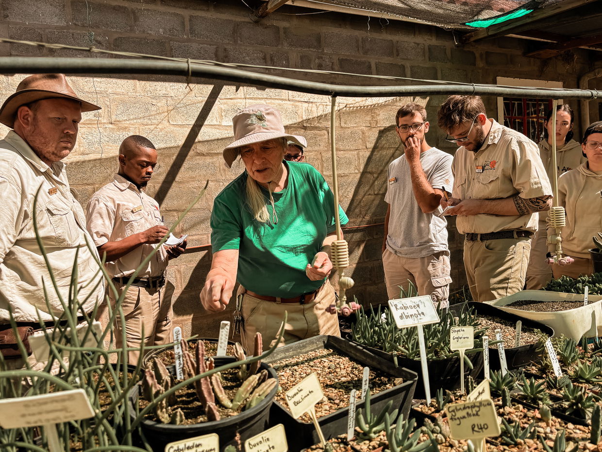 For our own staff, this was highly valuable. Cango Wildlife is constantly working toward improving the sustainability and resilience of our gardens and planted spaces, and looking ahead, we want to be smarter and more intentional in how we cultivate indigenous plant life on our site. For our conservation student AJ, it was an opportunity to strengthen veld and ecology knowledge in a real-world setting, and for our international volunteers, it offered something equally important: connection to the Karoo beyond the animals at our facility, looking to the soil, the plants, and the subtle survival strategies that make this place what it is.